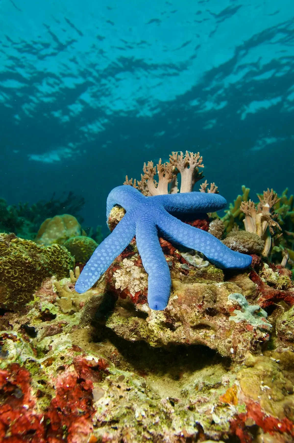L'étoile de mer est un échinoderme marin à symétrie radiale, possédant généralement cinq bras (mais certaines espèces en ont bien plus). Son corps est recouvert d’une peau rugueuse avec des plaques calcaires et parfois des épines pour se protéger des prédateurs. Elle se déplace grâce à de nombreux petits pieds ambulacraires situés sous ses bras, qui fonctionnent avec un système hydraulique interne. Une caractéristique fascinante des étoiles de mer est leur capacité de régénération : elles peuvent repousser un bras perdu et certaines espèces peuvent même se cloner à partir d’un bras coupé. Pas de cerveau ni de sang, mais un système nerveux simple et un système circulatoire basé sur l’eau de mer.