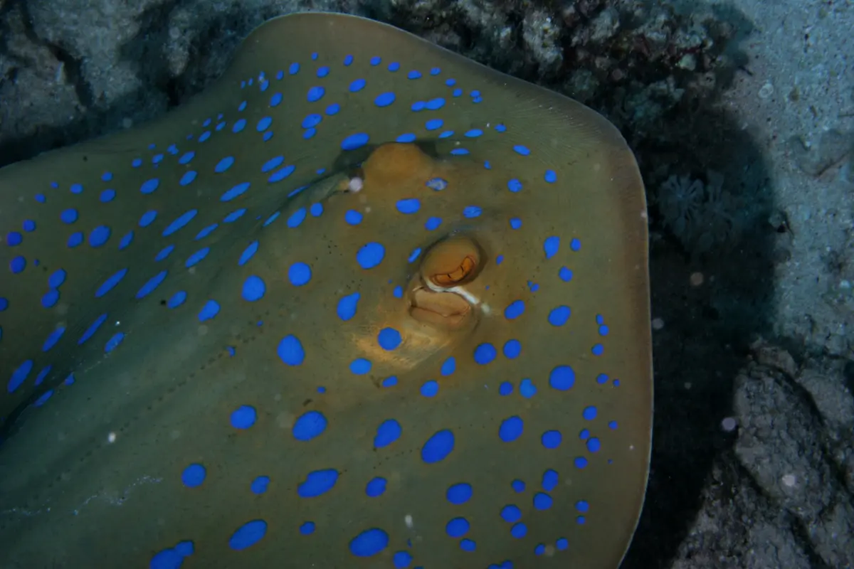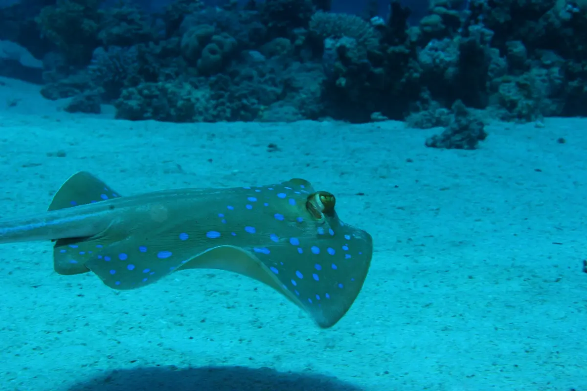 La raie à points bleus est un poisson cartilagineux facilement reconnaissable grâce à son corps aplati en forme de disque de couleur jaune-brun, orné de taches bleues vives. Son corps est lisse, sans écailles, et sa queue fine et allongée porte un ou plusieurs dards venimeux. Elle possède de grands yeux proéminents, situés sur le dessus de sa tête, lui permettant de surveiller son environnement tout en restant enfouie sous le sable. Elle utilise son venin en dernier recours pour se défendre contre les prédateurs (requins, grands poissons, dauphins).