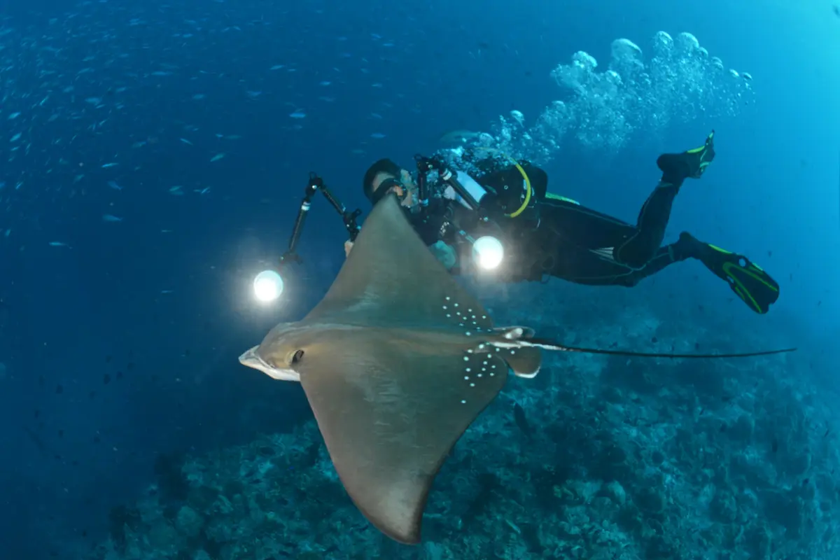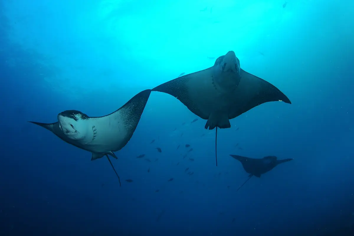 Les raies aigles mesurent entre 1 et 3 mètres et pèsent jusqu’à 250 kilos.