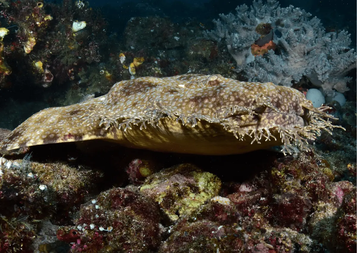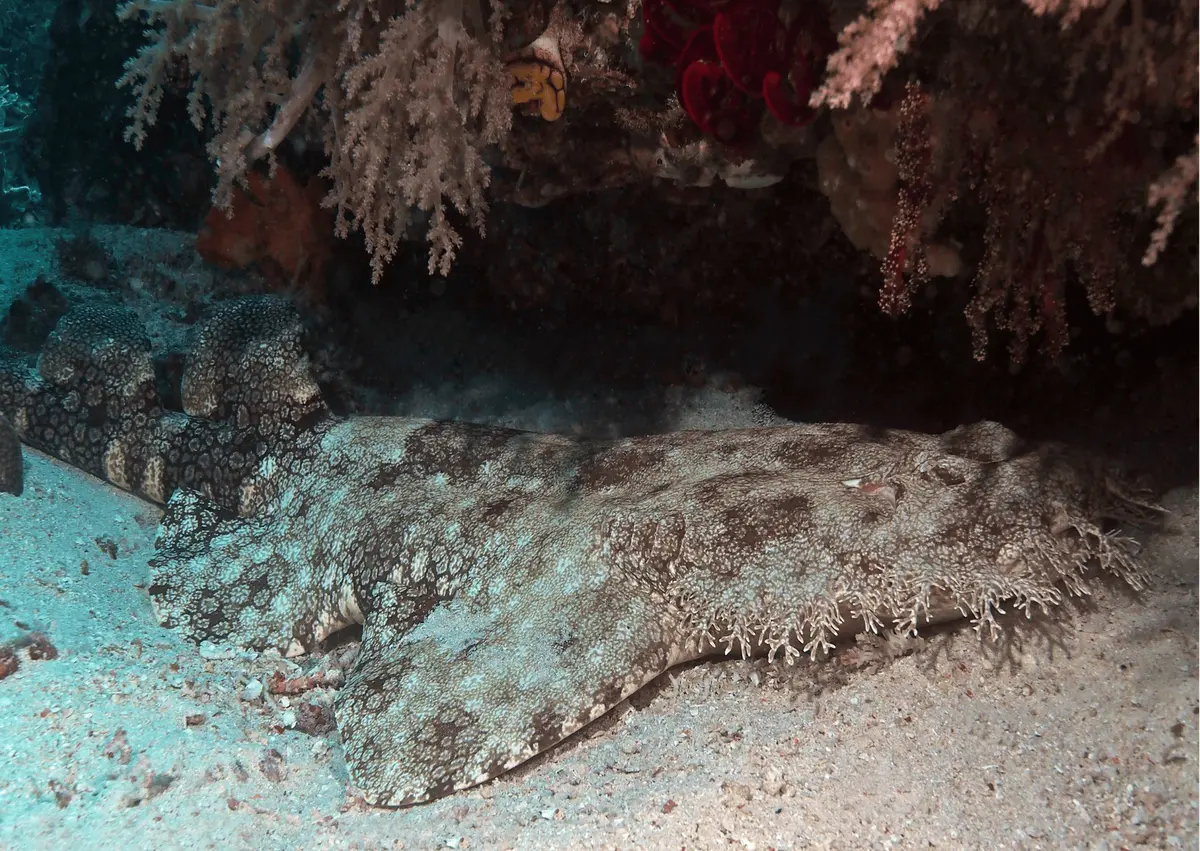 Ils vivent allongés sur le fond comme des carpettes, grâce à un corps tout plat, fripé et parfaitement camouflé. Leur dents en formes de crocs de chien forment une sorte de filet qui piège ou empale les proies.